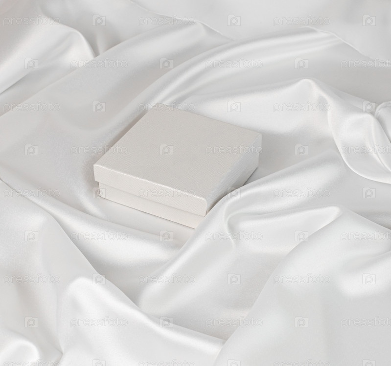 Подарочная коробка лежит на белом атласном драпированном фоне