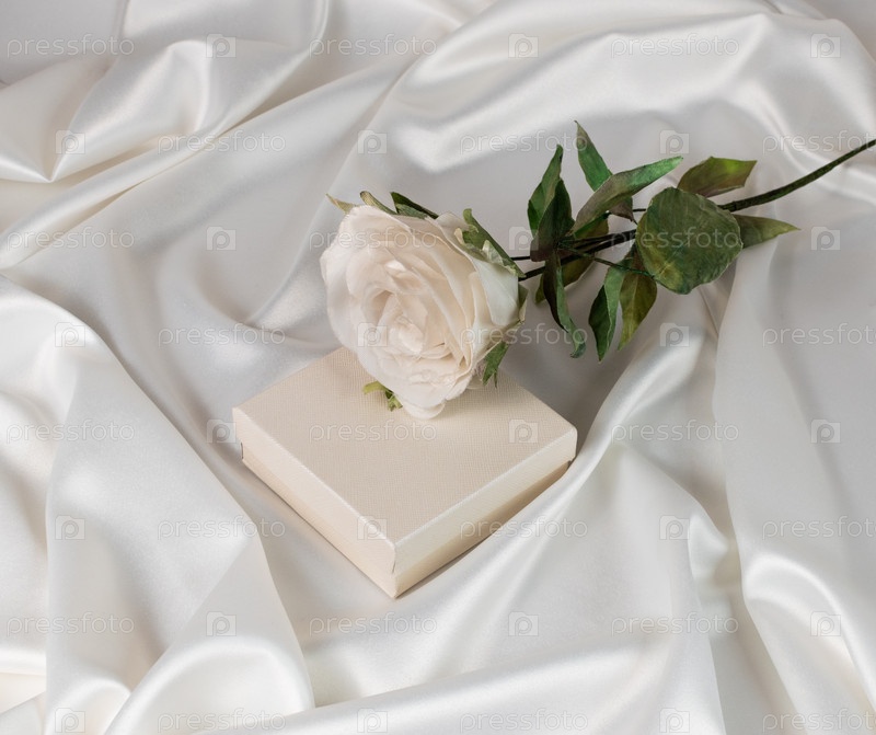 Белая роза лежит на подарочной коробке на фоне белой атласной драпировки