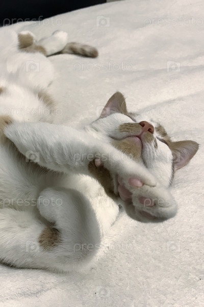 Кот спит на белом одеяле. В странной позе. Шерсть красно-белая. Держит лапу вверх