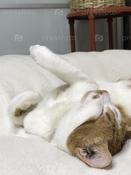 Кот спит на белом одеяле. Шерсть красно-белая. Он спит на спине, подняв лапы