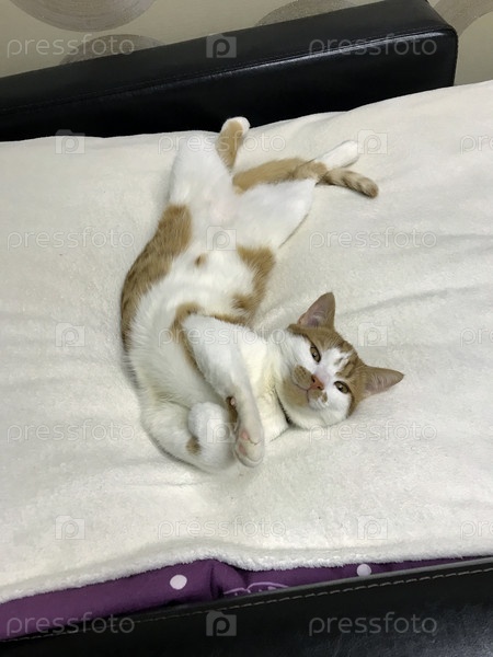 Кот лежит на белом одеяле. Шерсть красно-белая. Он спит на боку, животом вверх