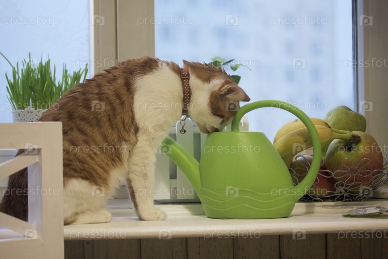 Кот на подоконнике. Шерсть красно-белая. Напитки из лейки для полива цветов
