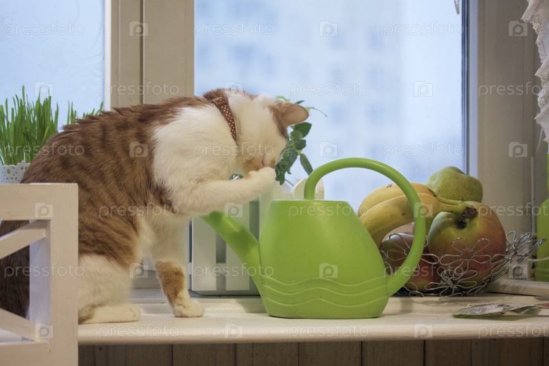 Кот на подоконнике. Шерсть красно-белая. Напитки из лейки для полива цветов