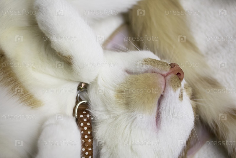 Морда спящего кота крупным планом. Шерсть красно-белая. Лежа на спине. Выстрел сверху