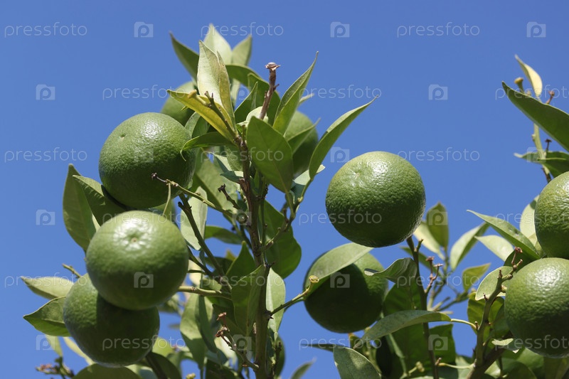 Зеленые незрелые мандарины на дереве. На фоне голубого неба. Турция, Анталья