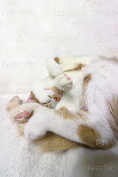 Кошка спит на белом одеяле. Свернулся в клубок. Шерсть красно-белая