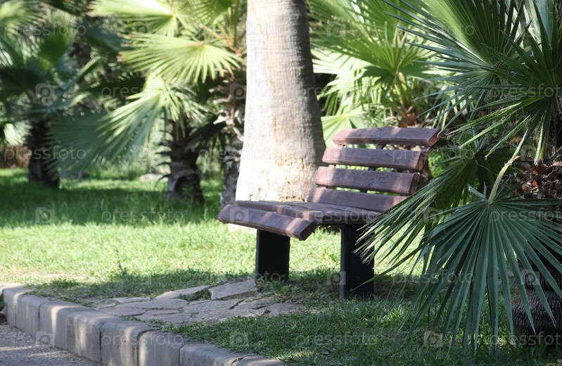 Деревянная скамейка в аллее городского парка. Рядом растут пальмы. Турция, Анталья