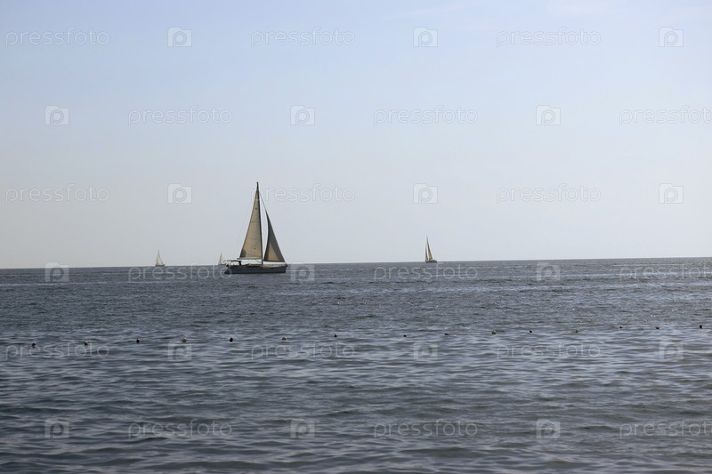 Парусные лодки в море. Поверхность воды и небо в дымке