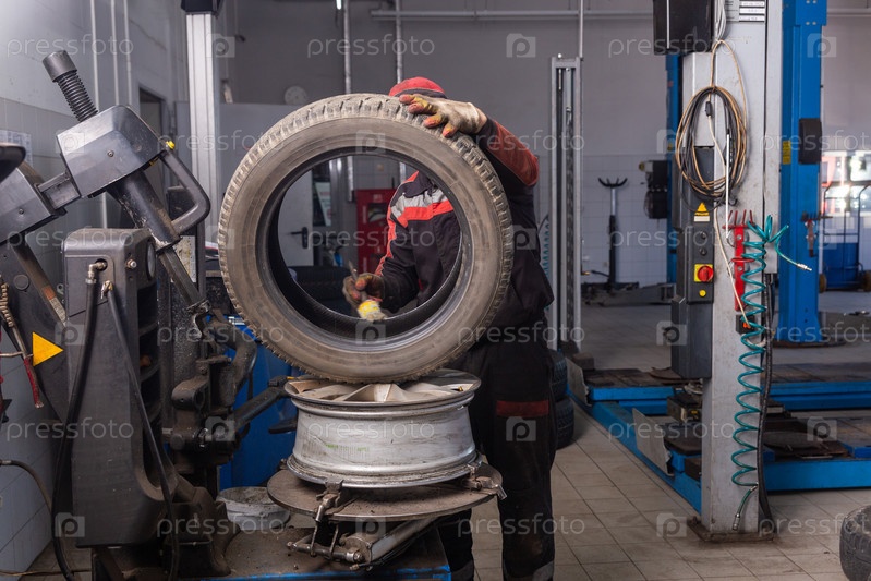 Автомеханик меняет шину на ободе в сервисном гараже. Крупный план механика в шиномонтажной мастерской, меняющего шины