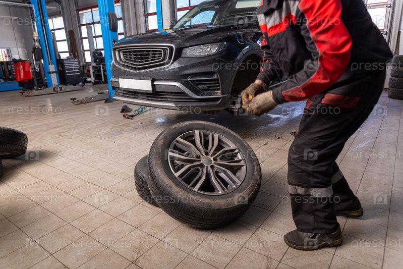 Работа в шиномонтажном центре. Замена резины на колесах автомобиля. Автошинный сервисный центр, авторемонтная мастерская