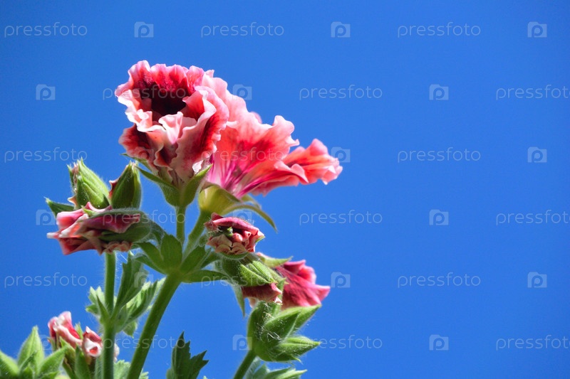 Королевские цветы пеларгонии на фоне голубого неба