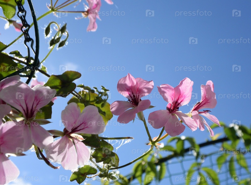 Ампильская пеларгония на фоне голубого неба с подсветкой