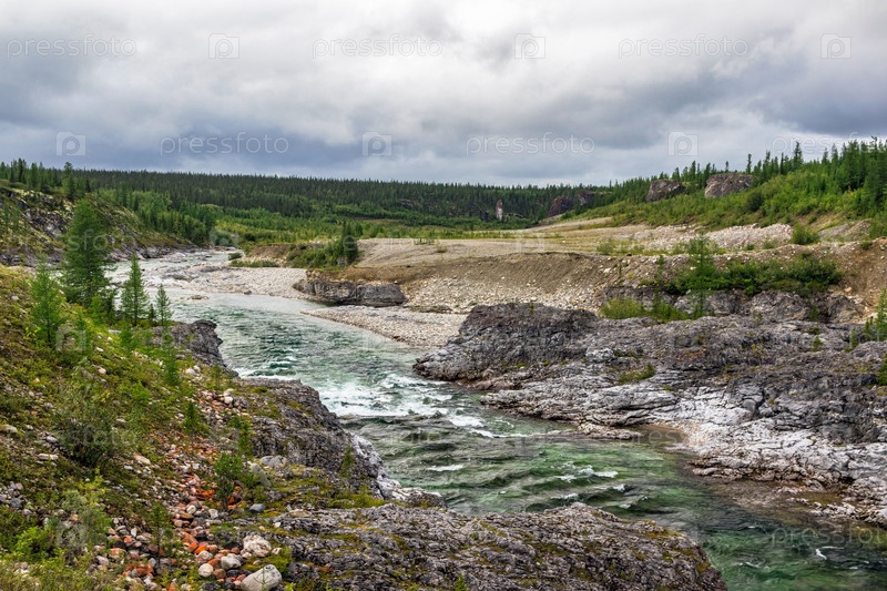 Северная река, текущая среди скал в лесной местности
