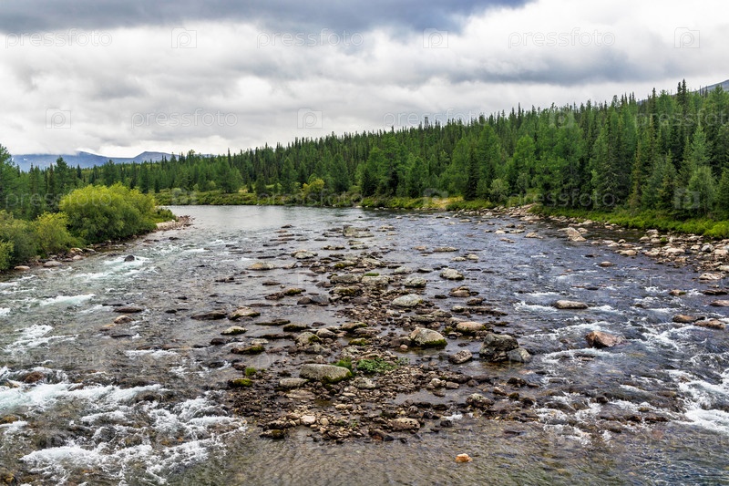 Северная река, текущая среди скал в лесной местности