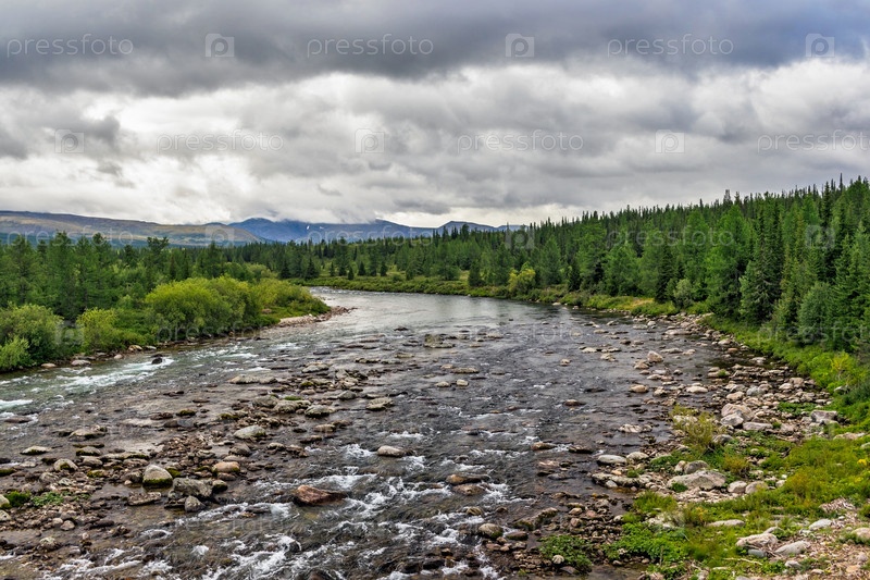 Северная река, текущая среди скал в лесной местности