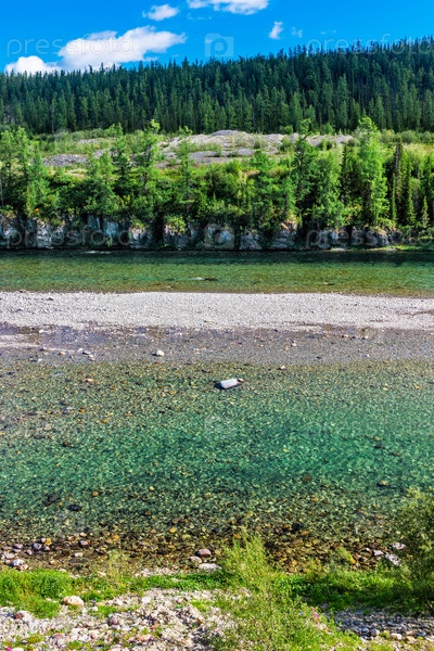 Северная река, текущая среди скал в лесной местности