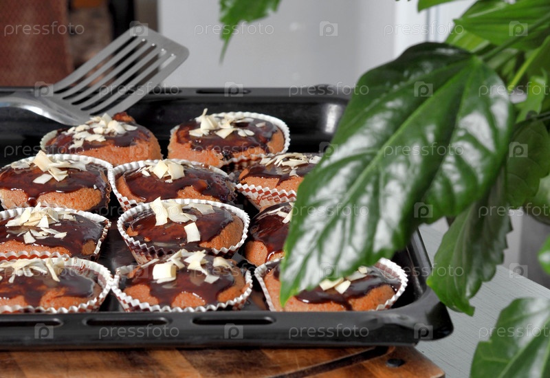 Домашние кексы в бумажных формах, покрытые шоколадной глазурью и посыпанные кокосовой стружкой