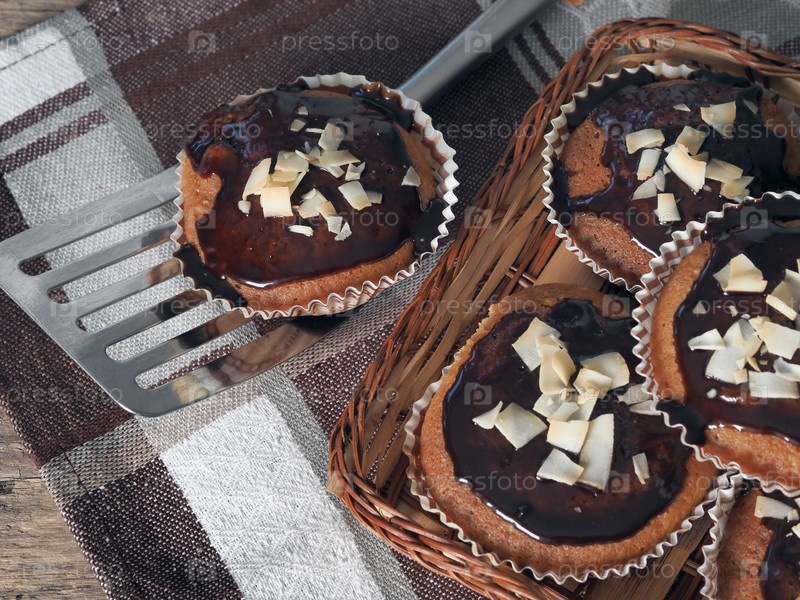 Крупным планом свежеиспеченные домашние кексы, покрытые шоколадной глазурью и посыпанные кокосовой стружкой. Домашняя здоровая еда