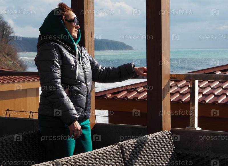 Старшая туристка проводит время на свежем воздухе в зимний день, расслабляясь и разговаривая по телефону. Холодный ветер и ненастная погода на море