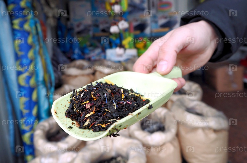 Натуральный органический чай разных сортов в пакетиках продается на небольшом рынке. Мужчина демонстрирует разные виды чая с добавками. Местные натуральные продукты на побережье Черного моря
