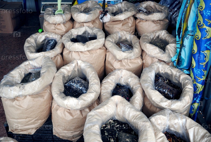 Натуральный органический чай разных сортов в мешках выставлен на продажу на небольшом рынке на побережье Черного моря. Местные натуральные продукты
