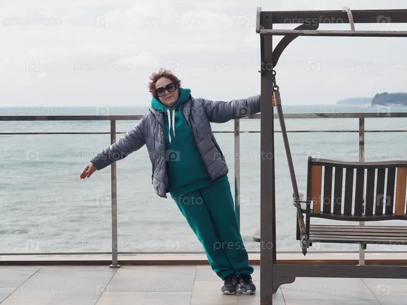 туристка проводит время на свежем воздухе в зимний день, расслабляясь и разговаривая по телефону. Холодный ветер и ненастная погода на море. Отдых на природе в любую погоду
