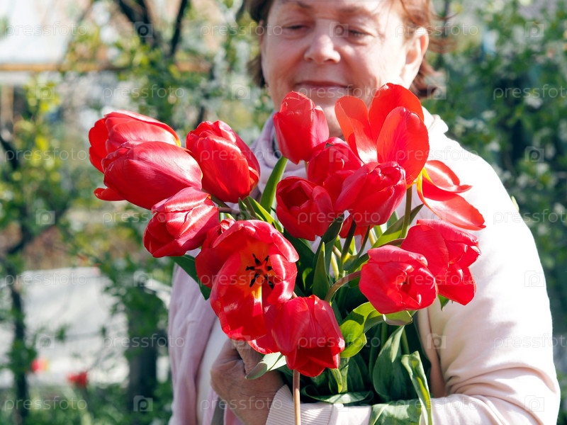 Красные яркие большие тюльпаны в руках пожилой женщины на естественном фоне