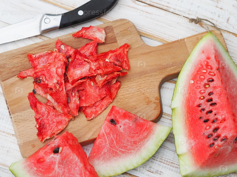 Сушеные и свежие ломтики арбуза на кухонной доске на деревянном белом столе