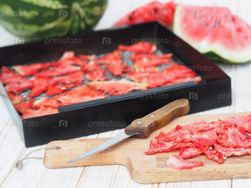 Сушеные кусочки арбуза в черных решетках из сушилки на фоне зеленого арбуза на белом деревянном столе