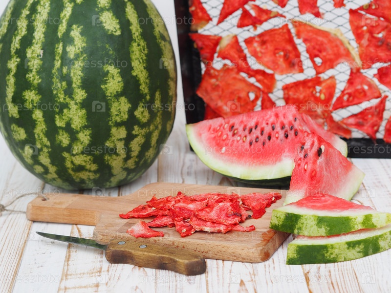Сушеные кусочки арбуза в черных решетках из сушилки на фоне зеленого арбуза на белом деревянном столе