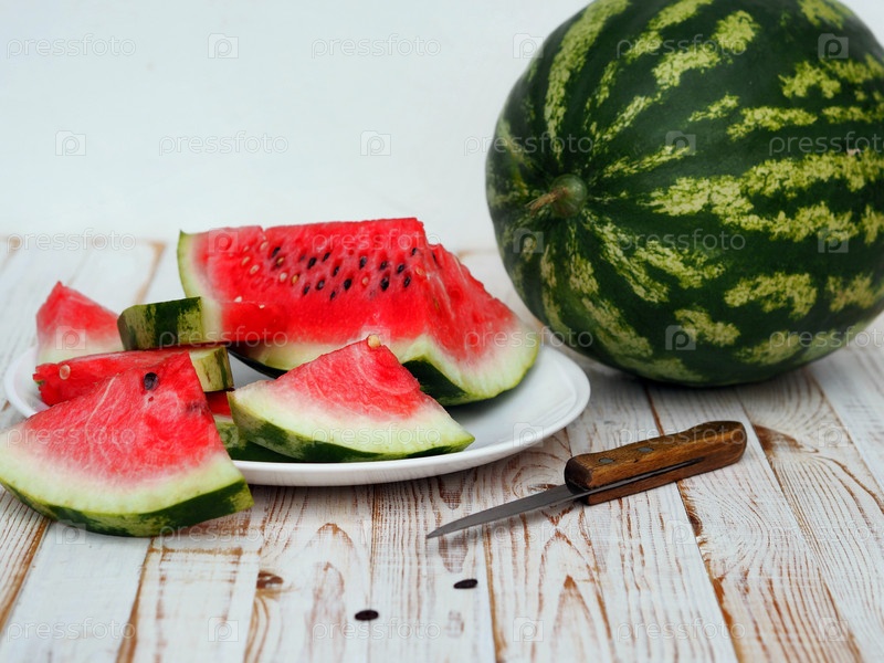Большой зеленый арбуз с красными ломтиками на деревянном белом столе
