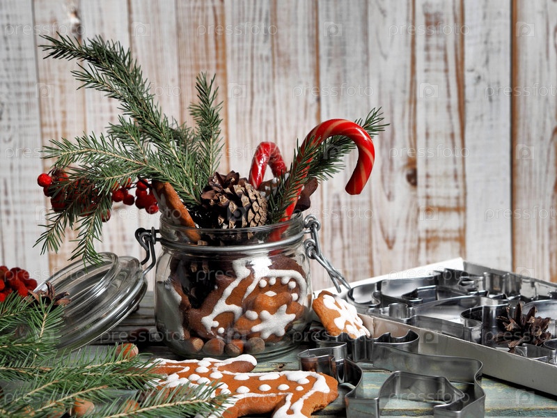 Стеклянная банка для хранения продуктов с пряниками, еловыми ветками, шишками и формочкой для печенья на старом деревянном фоне. Рождественский ретро-фон еды