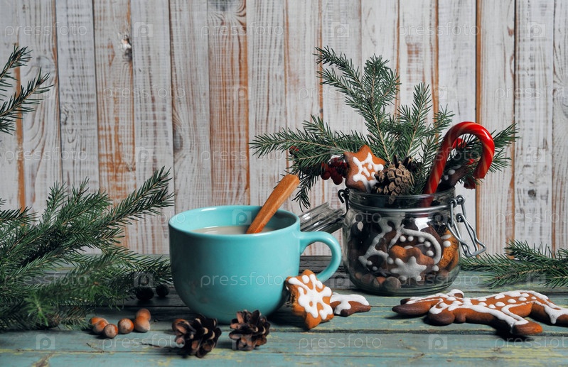 Синяя чашка с кофе, пряниками, еловыми ветками и шишками на старом деревянном фоне. Рождественский ретро-фон еды. Место для текста. Баннер