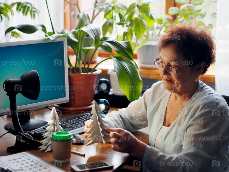 Пожилая женщина, работающая дома за компьютером, принимает участие в онлайн-уроке изготовления бумаги во время Рождества и Нового года. Счастливая бабушка делает елки из бумаги перед компьютером