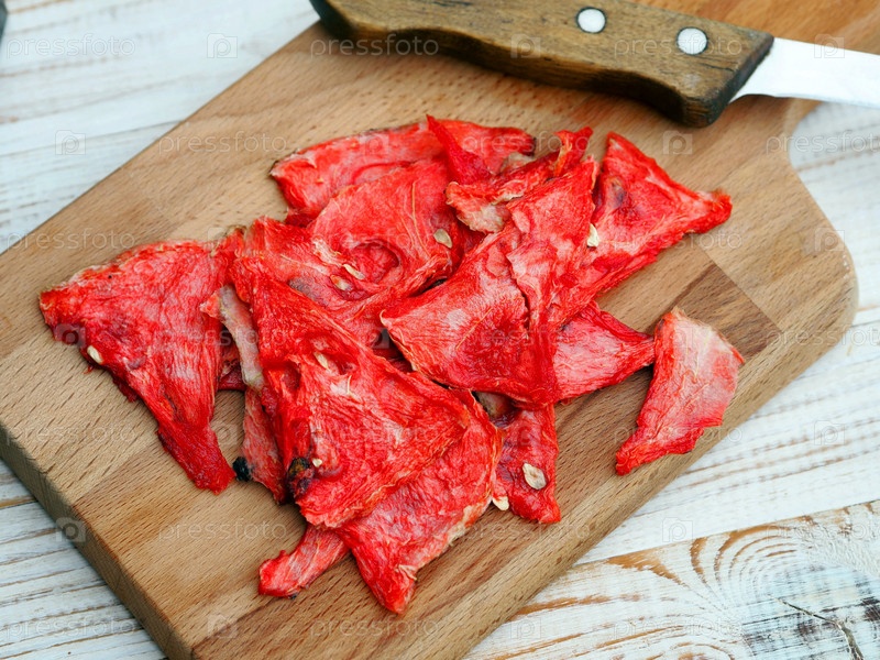 Сушеные и свежие ломтики арбуза на кухонной доске на деревянном белом столе. Домашние сладкие чипсы в сушилке. Осенняя заготовка сладостей впрок