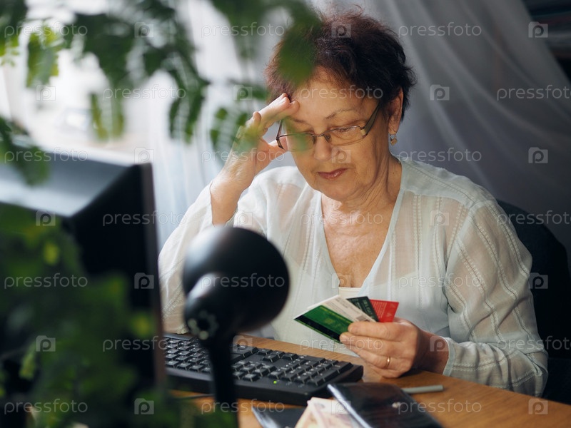 Пожилая женщина совершает онлайн-покупки с помощью компьютера и кредитной карты, сидя дома. Онлайн покупки