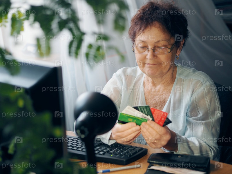 Пожилая женщина совершает онлайн-покупки с помощью компьютера и кредитной карты, сидя дома. Онлайн покупки
