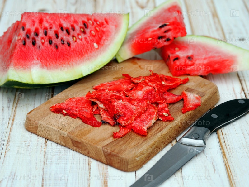 Сушеные и свежие ломтики арбуза на кухонной доске на деревянном белом столе. Домашние сладкие чипсы в сушилке. Осенняя заготовка сладостей впрок