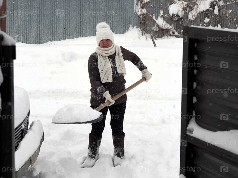 Зимний солнечный день. Женщина в валенках очищает лопатой территорию вокруг частного дома от снега. Устранение последствий снегопада