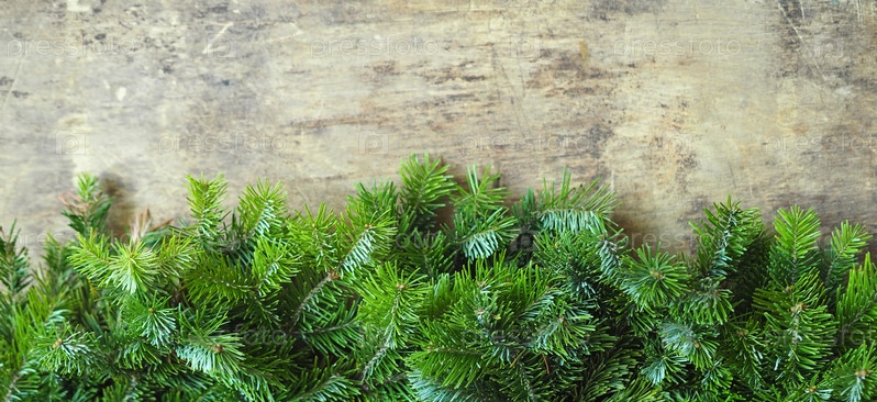 Деревянный древний природный фон с еловыми ветками. Рождественская и новогодняя открытка