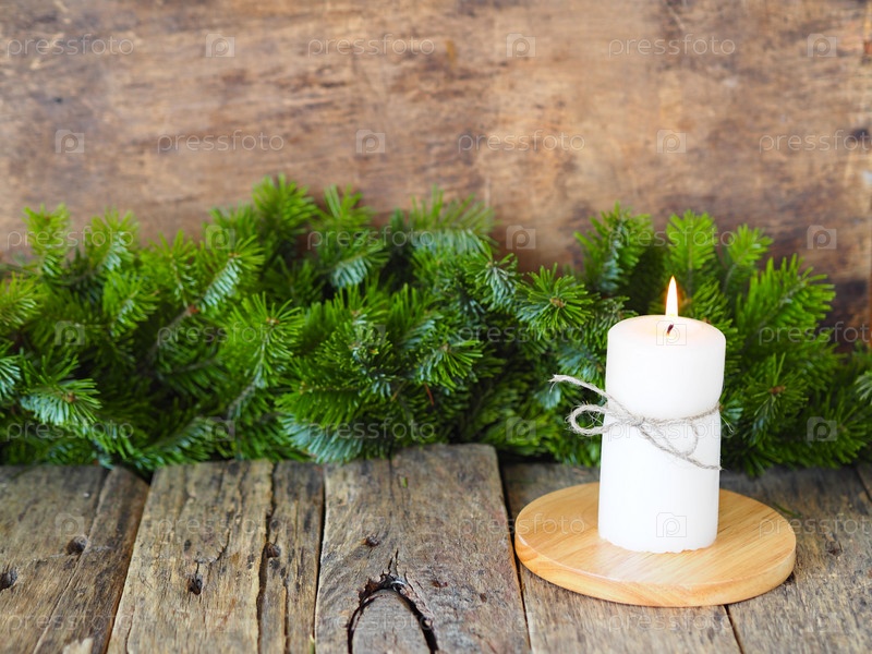 Открытка. Рождественский натюрморт с зажженной свечой, еловыми ветками, сосновыми шишками на деревянном фоне. Место для текста