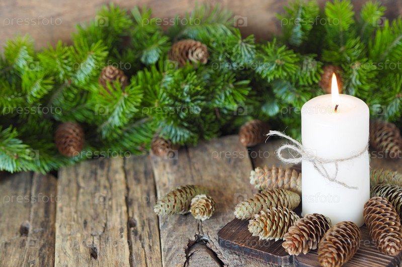 Рождественская открытка. Горящая свеча в окружении еловых шишек на деревянном фоне с еловыми ветками