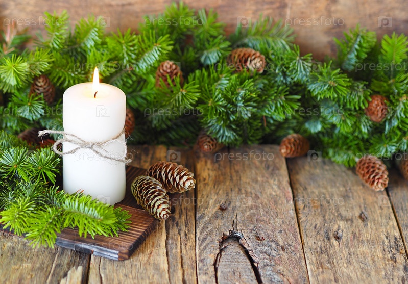 Рождественская открытка. Горящая свеча на деревянном фоне с еловыми ветками