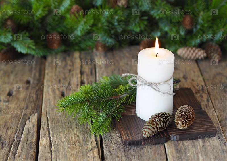 Рождественская горящая свеча на старинном деревянном фоне с еловыми ветками и шишками. Поздравления с Новым годом