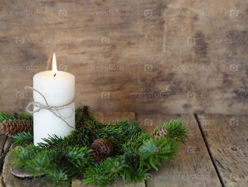 Открытка. Еловые ветки раскладываются вокруг зажженной новогодней свечи. Рождественский натюрморт. Место для вашего текста