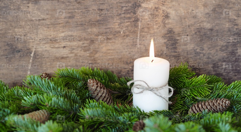 Открытка. Вокруг зажженной новогодней свечи раскладывают еловые ветки. Рождественский натюрморт. Место для вашего текста