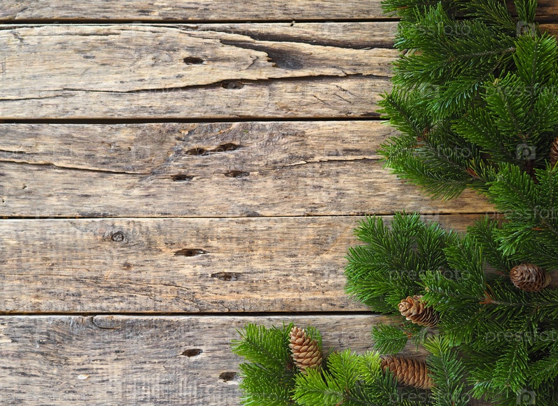 Рождественская открытка с местом для текста. Еловые ветки выложены на деревянном фоне