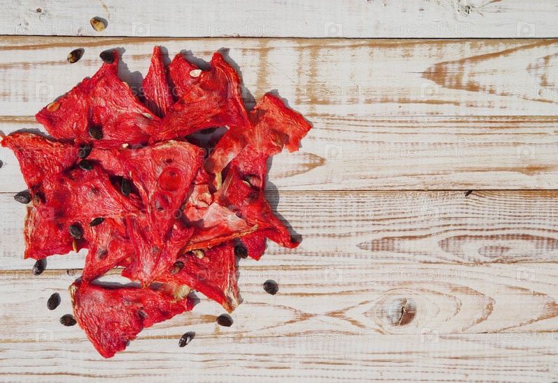 Сушеные кусочки арбуза на деревянном белом столе