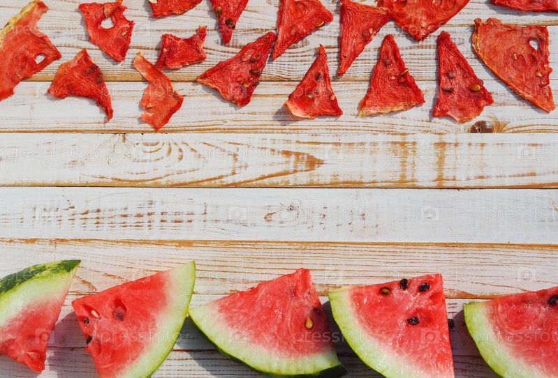 Здоровая пища из натуральных продуктов. Сушеные и свежие ломтики арбуза на белом деревянном столе