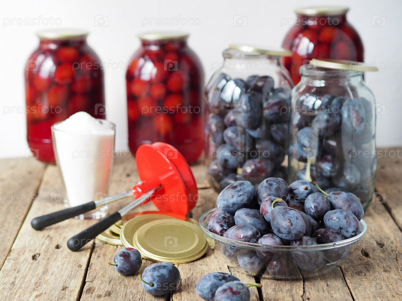 Идея консервирования сливового компота впрок в стеклянных банках на деревянном столе. Голубая слива, укупорочная машина и сахар на фоне готового компота в банках